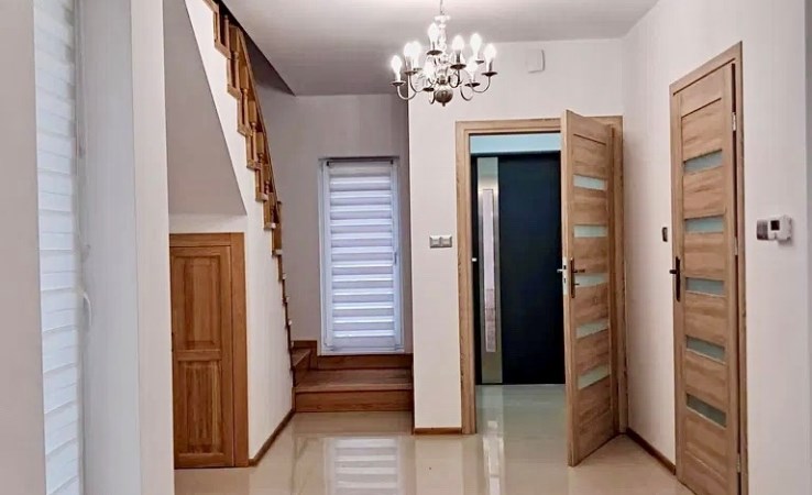 Funkcjonalny układ pomieszczeń, parter domu składa się z wiatrołapu wyposażonego w zabudowę meblową, przestronnego i słonecznego salonu z bezpośrednim wyjściem na duży taras, jadalni oraz kuchni wyposażonej w zabudowę meblową wraz ze sprzętem AGD (tj. lodówka, ekspres do kawy marki Siemens, piekarnik marki Siemens, piekarnik marki Whirpool, płyta indukcyjna marki Siemens , okap, zmywarka), a także łazienki wyposażonej w kabinę prysznicową, pomieszczenia gospodarczego z zabudową meblową.
