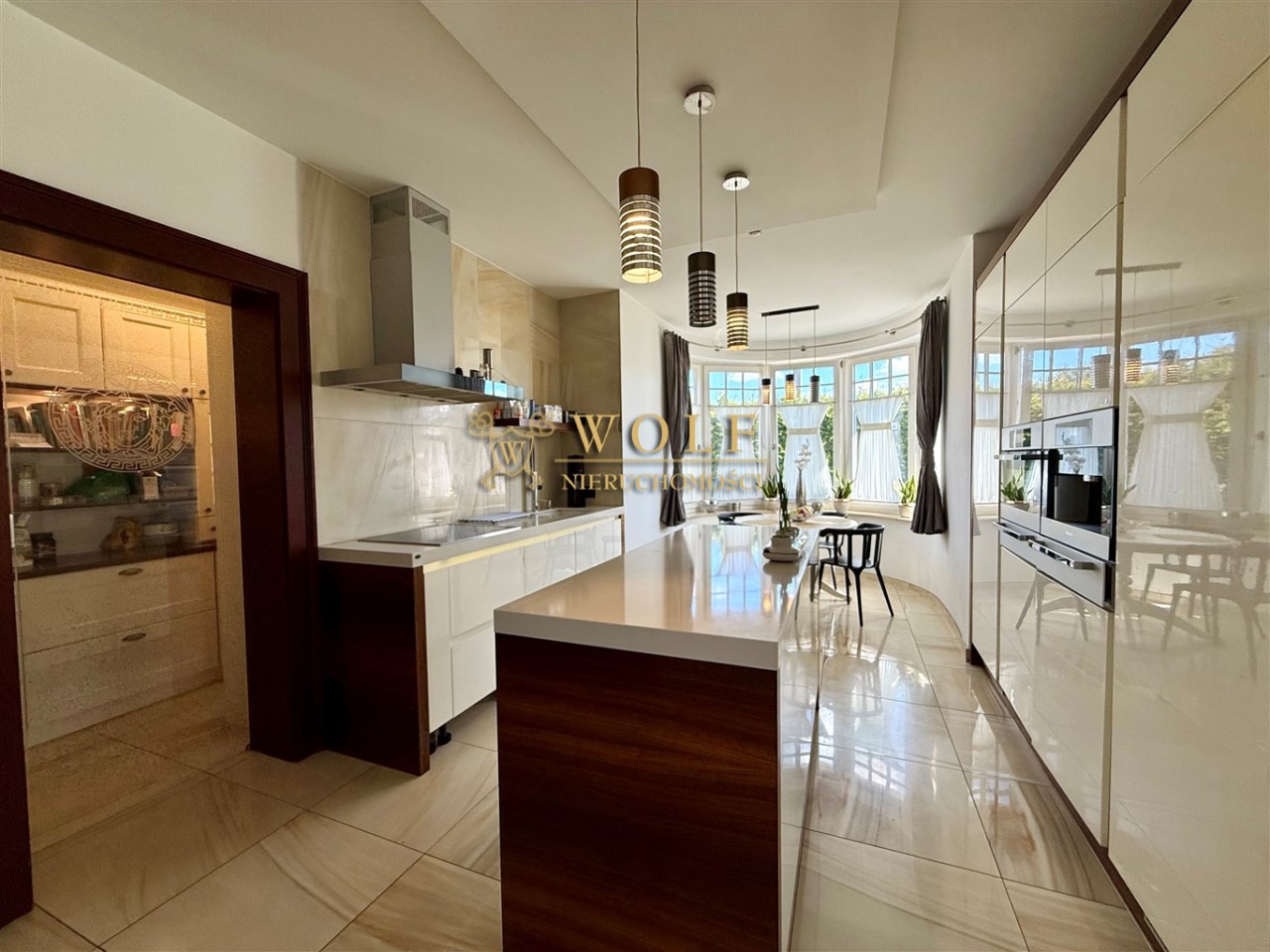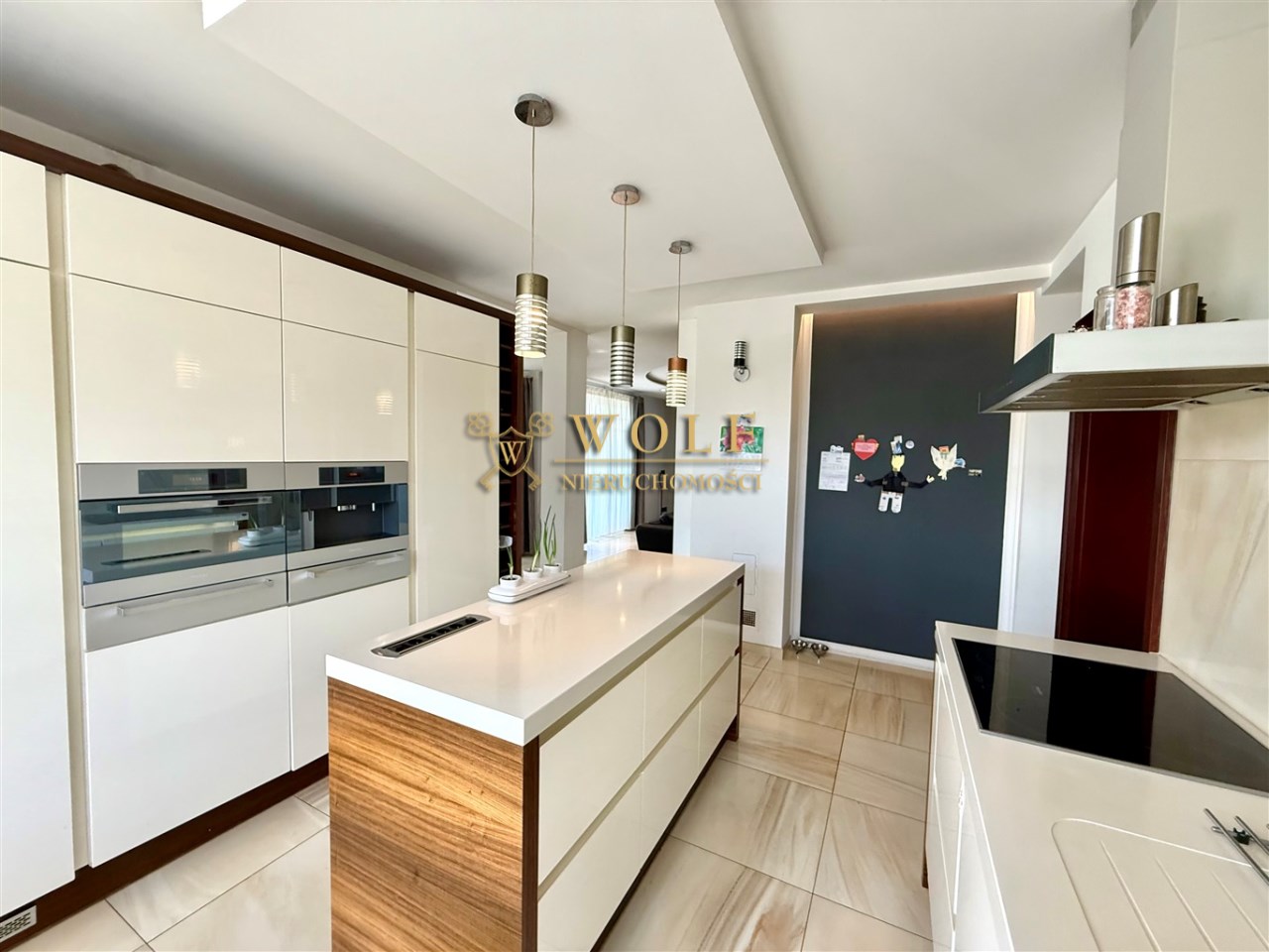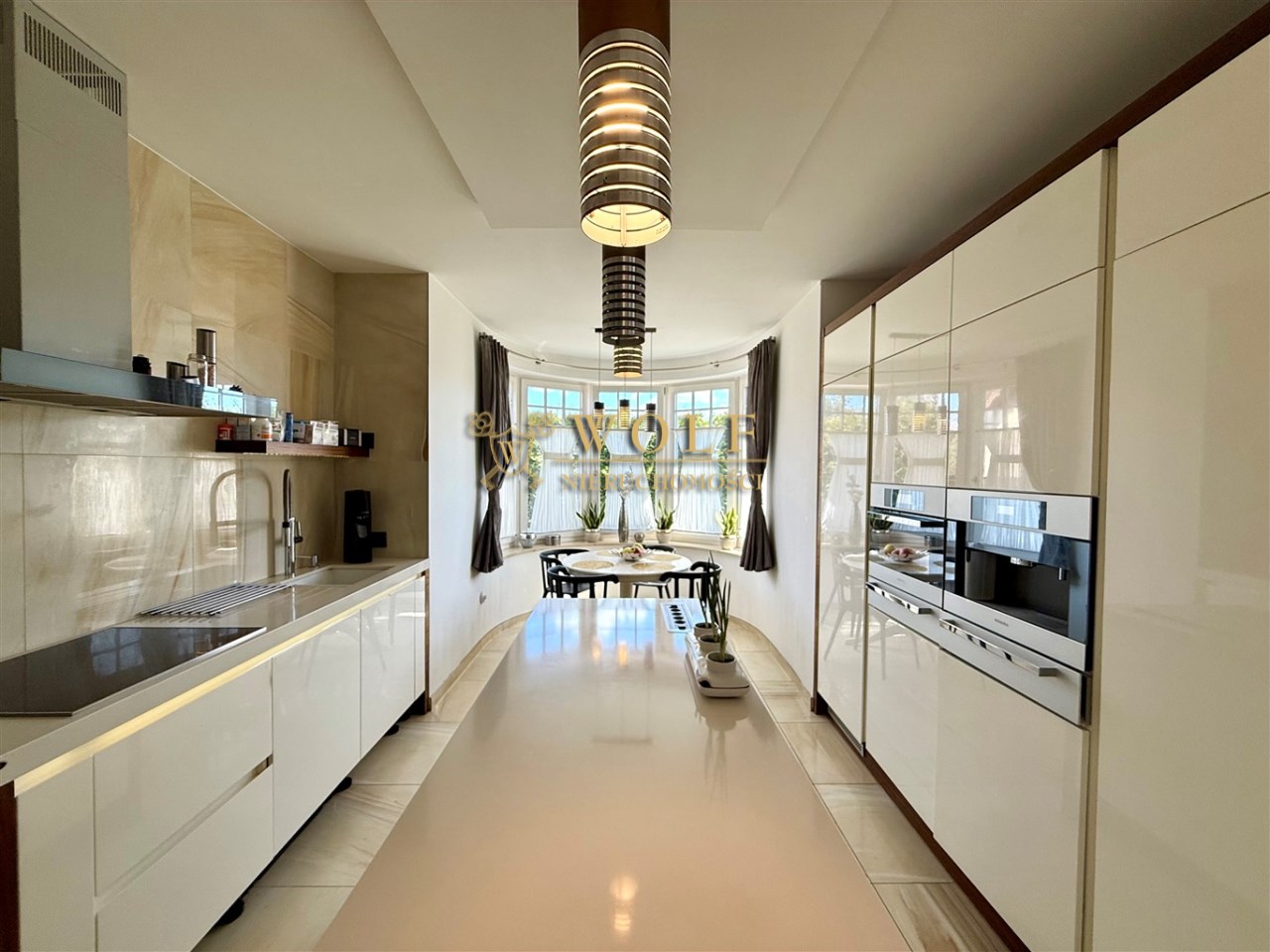 nowoczesna, otwarta kuchnia z wysokiej klasy zabudową i sprzętem AGD (lodówka, piekarnik, kawiarka, zmywarka, płyta indukcyjna),