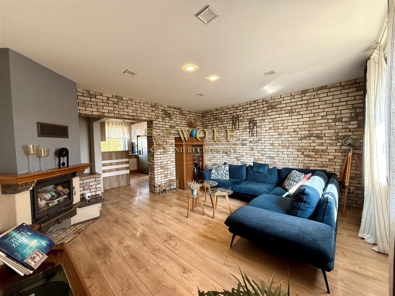 Słoneczny salon z kominkiem i kompletem wypoczynkowym