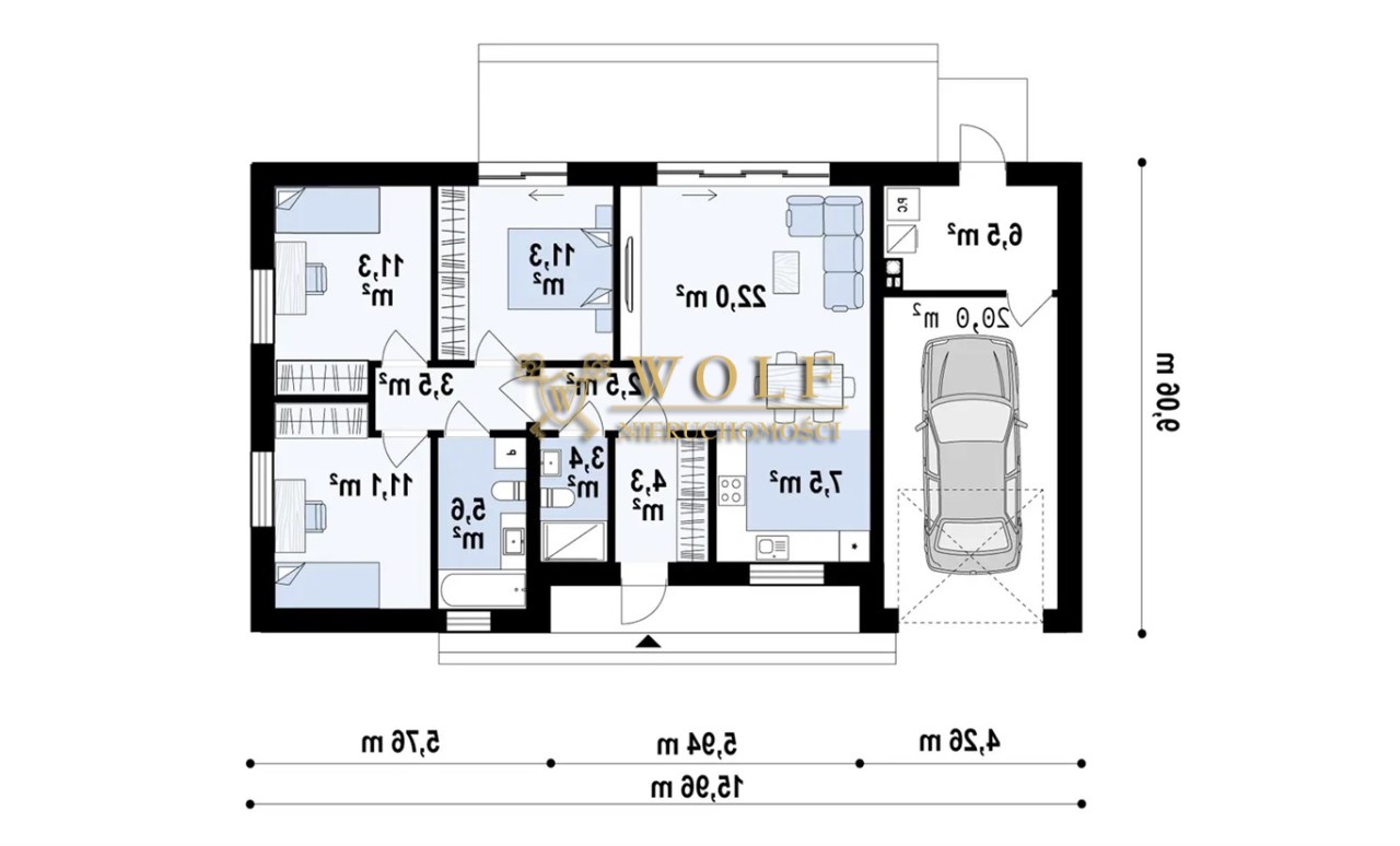 3 oddzielne sypialnie usytuowane w części ,,nocnej" budynku