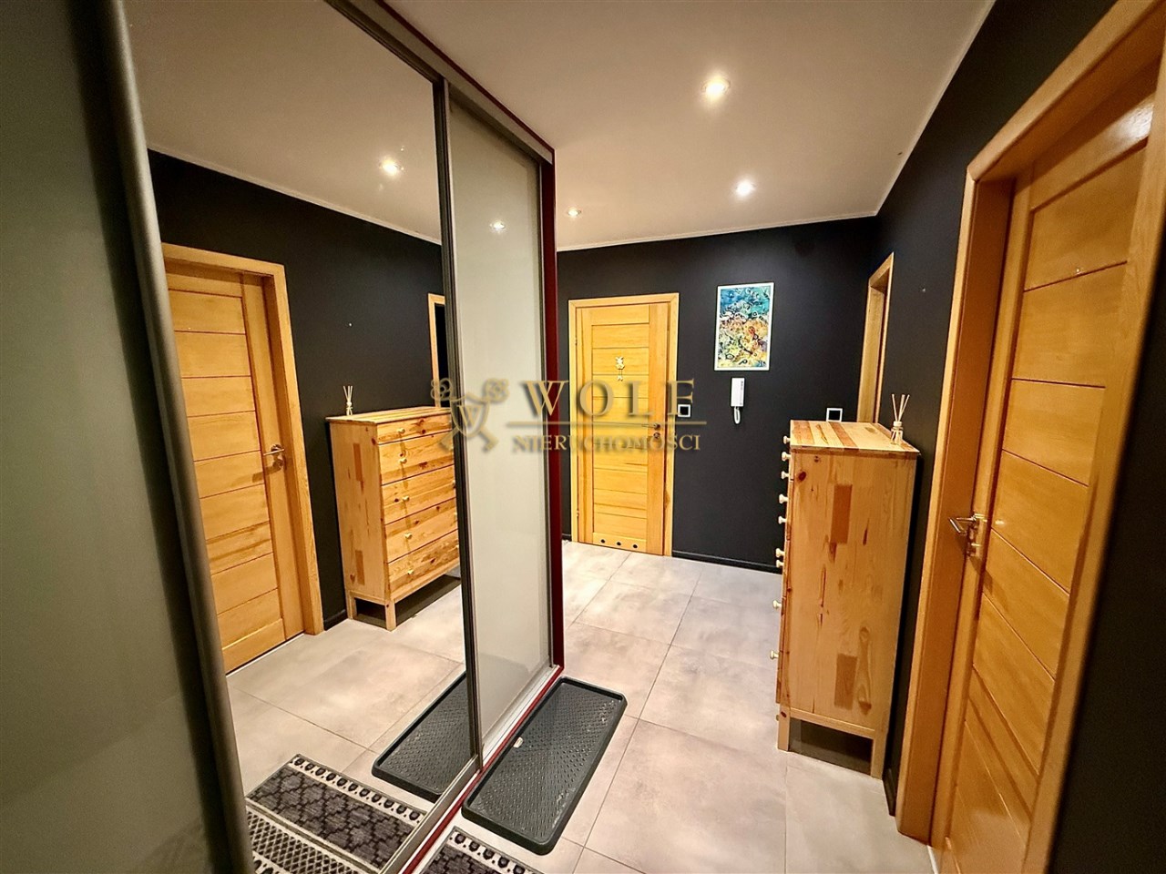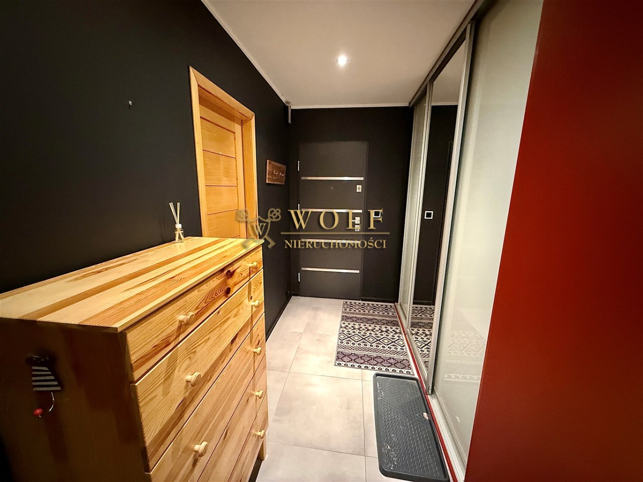 Przedpokoju z praktyczną zabudowaną szafą.
